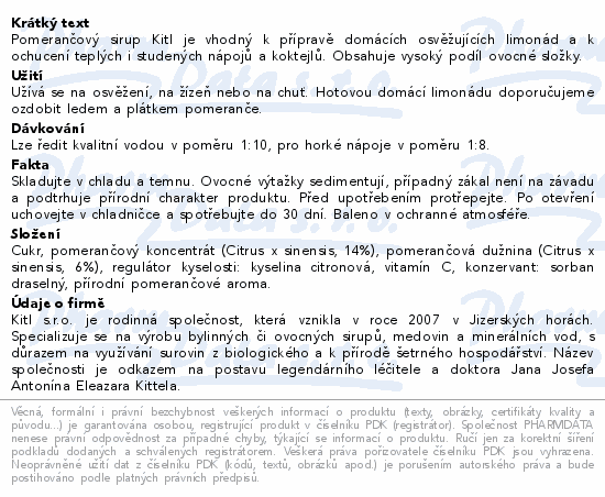 Kitl Syrob Pomeranč je poctivý sirup pro přípravu domácích limonád. Obsahuje vysoký podíl ovocné složky, 100ml sirupu je vyrobeno ze 108 ml ovocné šťávy a dužniny. Syrob je zpracován za studena, díky tomu má skvělou chuť a mnoho zdraví prospěšných látek.