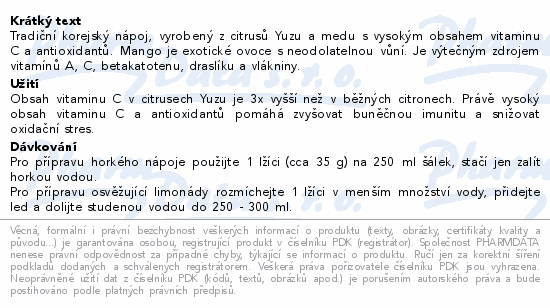 Tradiční korejský nápoj, vyrobený z citrusů Yuzu a medu s vysokým obsahem vitaminu C a antioxidantů. Mango je exotické ovoce s neodolatelnou vůní. Je výtečným zdrojem vitamínů A, C, betakatotenu, draslíku a vlákniny.