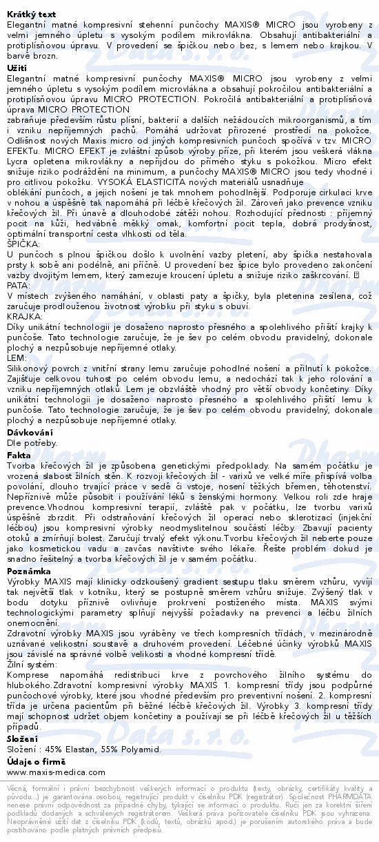 Elegantní matné kompresivní stehenní punčochy MAXIS® MICRO jsou vyrobeny z velmi jemného úpletu s vysokým podílem mikrovlákna. Obsahují antibakteriální a protiplísňovou úpravu. V provedení se špičkou nebo bez, s lemem nebo krajkou. V barvě brozn.