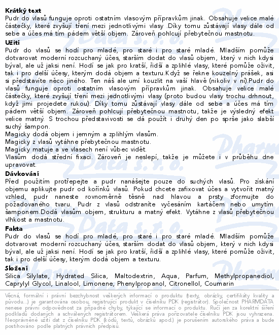 Pudr do vlasů funguje oproti ostatním vlasovým přípravkům jinak. Obsahuje velice malé částečky, které zvyšují tření mezi jednotlivými vlasy .Díky tomu zůstávají vlasy dále od sebe a účes má tím pádem větší objem. Zároveň pohlcují přebytečnou mastnotu.