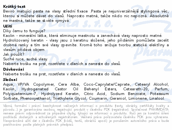 Beviro matující pasta na vlasy střední fixace .Pasta je nejuniverzálnější stylingová věc, kterou si můžete dávat do vlasů. Naprosto matná, takže nikdo nic nepozná. Absolutně ne mastná, takže se skvěle vymývá.