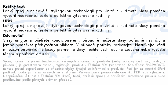 Lehký sprej s nejnovější stylingovou technologii pro vlnité a kudrnaté vlasy pomáhá vytvořit hedvábné, lesklé a perfektně vytvarované kudrliny.