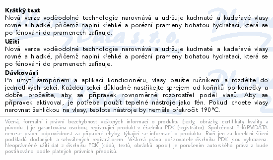 Nová verze voděodolné technologie narovnává a udržuje kudrnaté a kadeřavé vlasy rovné a hladké, přičemž naplní křehké a porézní prameny bohatou hydratací, která se po fénování do pramenech zafixuje.