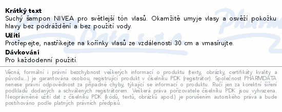 Suchý šampon NIVEA pro světlejší tón vlasů. Okamžitě umyje vlasy a osvěží pokožku hlavy bez podráždění a bez použití vody.