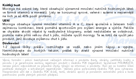 Moringa má vzácné listy, které obsahující významné množství nutričně hodnotných látek ve formě vitamínů a minerálů. Listy se konzumují syrové, vařené i sušené a nejcennější na nich je až 40% podíl proteinů.