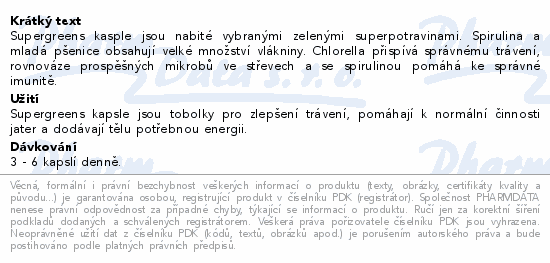 Supergreens kasple jsou nabité vybranými zelenými superpotravinami. Spirulina a mladá pšenice obsahují velké množství vlákniny. Chlorella přispívá správnému trávení, rovnováze prospěšných mikrobů ve střevech a se spirulinou pomáhá ke správné imunitě.