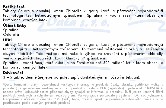Tablety Chlorella obsahují kmen Chlorella vulgaris, která je pěstována nejmodernější technologií tzv. heterotrofným způsobem. Spirulina - vodní řasa, která obsahuje kombinaci cenných látek.