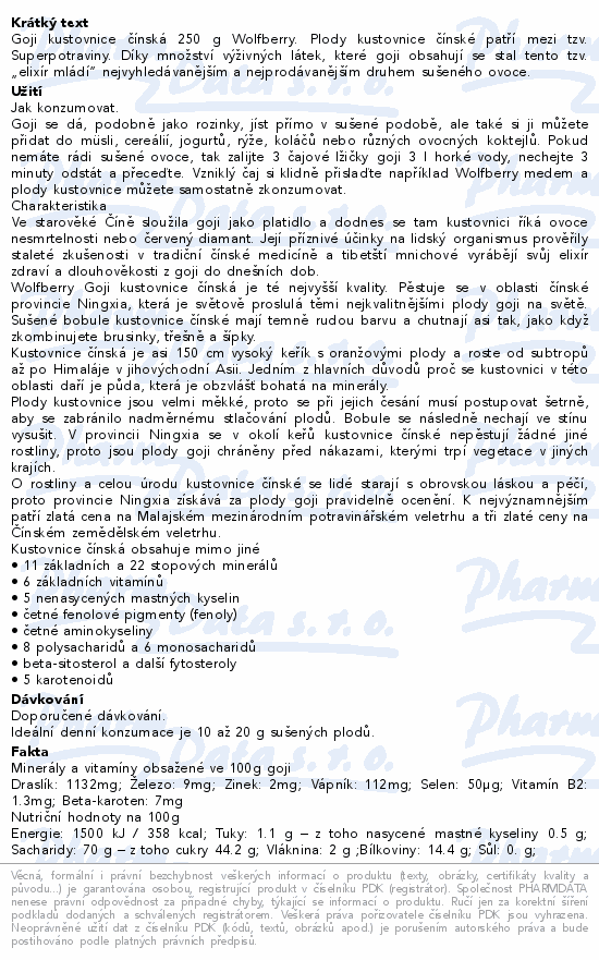 Goji kustovnice čínská 250 g Wolfberry. Plody kustovnice čínské patří mezi tzv. Superpotraviny. Díky množství výživných látek, které goji obsahují se stal tento tzv. „elixír mládí“ nejvyhledávanějším a nejprodávanějším druhem sušeného ovoce.