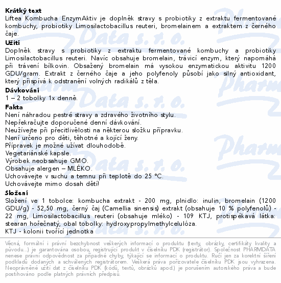 Liftea Kombucha EnzymAktiv je doplněk stravy s probiotiky z extraktu fermentované kombuchy, probiotiky Limosilactobacillus reuteri, bromelainem a extraktem z černého čaje.