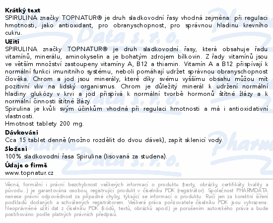 SPIRULINA značky TOPNATUR® je druh sladkovodní řasy vhodná zejména: při regulaci hmotnosti, jako antioxidant, pro obranyschopnost, pro správnou hladinu krevního cukru.