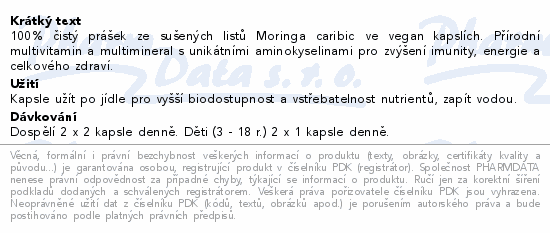 100% čistý prášek ze sušených listů Moringa caribic ve vegan kapslích. Přírodní multivitamin a multimineral s unikátními aminokyselinami pro zvýšení imunity, energie a celkového zdraví.