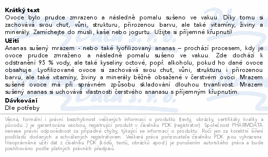 Ovoce bylo prudce zmrazeno a následně pomalu sušeno ve vakuu. Díky tomu si zachovává svou chuť, vůni, strukturu, přirozenou barvu, ale také vitamíny, živiny a minerály. Zamíchejte do müsli, kaše nebo jogurtu. Užijte si příjemné křupnutí!