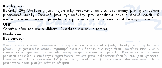 Borůvky 20g Wolfberry jsou nejen díky modrému barvivu oceňovány pro jejich zdraví prospěšné účinky. Zároveň jsou vyhledávány pro lahodnou chuť a široké využití. S metodou sušení mrazem je zachována přirozená barva, aroma i chuť čerstvých plodů.