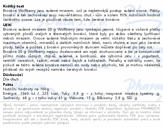 Broskve Wolfberry jsou sušené mrazem, což je nejšetrnější postup sušení ovoce. Plátky broskví si tak zachovávají svoji neuvěřitelnou chuť i vůni a kolem 90% nutričních hodnot čerstvého ovoce. Lze je používat všude tam, kde čerstvé broskve.