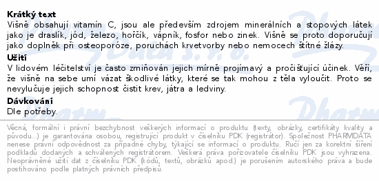 Višně obsahují vitamín C, jsou ale především zdrojem minerálních a stopových látek jako je draslík, jód, železo, hořčík, vápník, fosfor nebo zinek. Višně se proto doporučují jako doplněk při osteoporóze, poruchách krvetvorby nebo nemocech štítné žlázy.