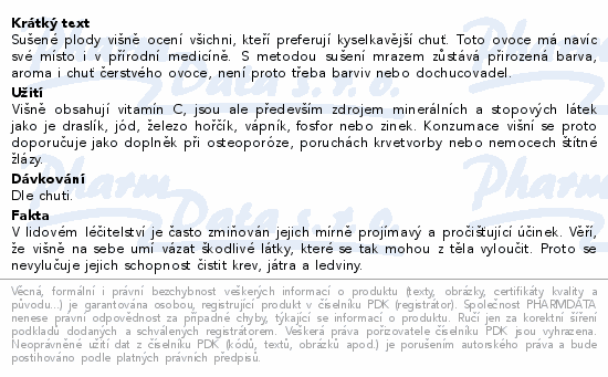Sušené plody višně ocení všichni, kteří preferují kyselkavější chuť. Toto ovoce má navíc své místo i v přírodní medicíně. S metodou sušení mrazem zůstává přirozená barva, aroma i chuť čerstvého ovoce, není proto třeba barviv nebo dochucovadel.