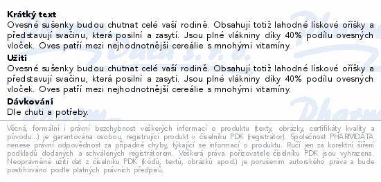 Ovesné sušenky budou chutnat celé vaší rodině. Obsahují totiž lahodné lískové oříšky a představují svačinu, která posilní a zasytí. Jsou plné vlákniny díky 40% podílu ovesných vloček. Oves patří mezi nejhodnotnější cereálie s mnohými vitamíny.