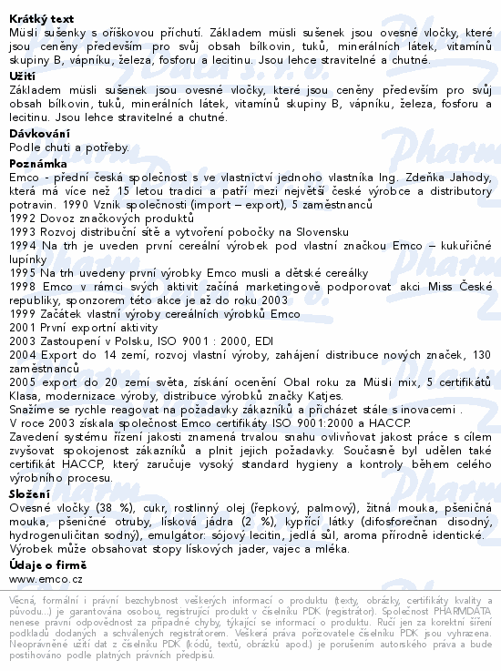 Müsli sušenky s oříškovou příchutí. Základem müsli sušenek jsou ovesné vločky, které jsou ceněny především pro svůj obsah bílkovin, tuků, minerálních látek, vitamínů skupiny B, vápníku, železa, fosforu a lecitinu. Jsou lehce stravitelné a chutné.