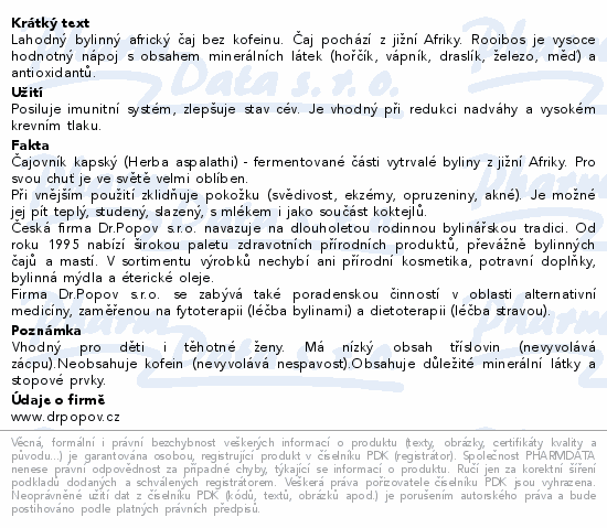 Lahodný bylinný africký čaj bez kofeinu. Čaj pochází z jižní Afriky. Rooibos je vysoce hodnotný nápoj s obsahem minerálních látek (hořčík, vápník, draslík, železo, měď) a antioxidantů.