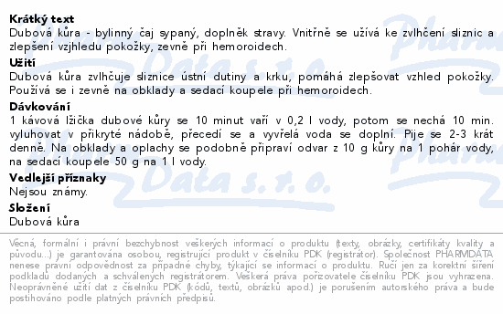 Dubová kůra - bylinný čaj sypaný, doplněk stravy. Vnitřně se užívá ke zvlhčení sliznic a zlepšení vzjhledu pokožky, zevně při hemoroidech.
