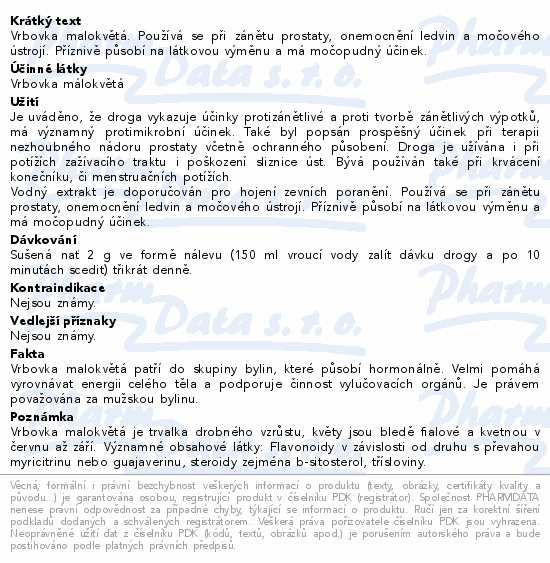 Vrbovka malokvětá. Používá se při zánětu prostaty, onemocnění ledvin a močového ústrojí. Příznivě působí na látkovou výměnu a má močopudný účinek.