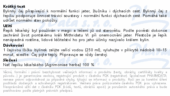 Bylinný čaj přispívající k normální funkci jater, žlučníku i dýchacích cest. Bylinný čaj z řepíku podporuje činnost trávicí soustavy i normální funkci dýchacích cest. Pomáhá také udržet normální stav pokožky.