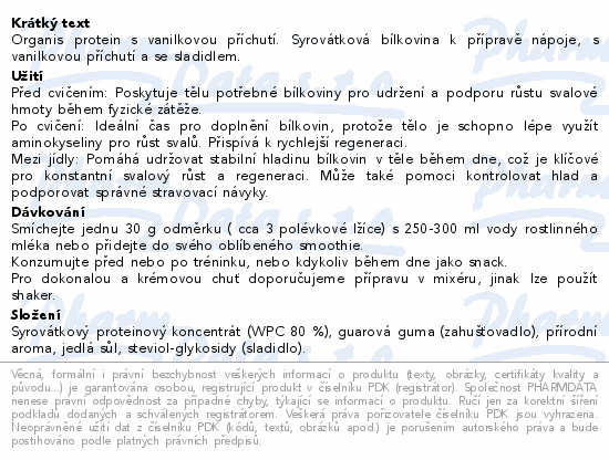 Organis protein s vanilkovou příchutí. Syrovátková bílkovina k přípravě nápoje, s vanilkovou příchutí a se sladidlem.