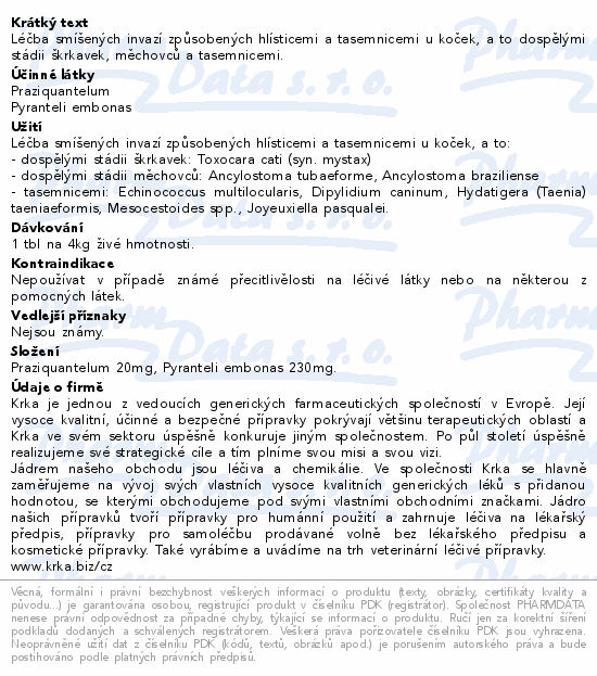 Léčba smíšených invazí způsobených hlísticemi a tasemnicemi u koček, a to dospělými stádii škrkavek, měchovců a tasemnicemi.