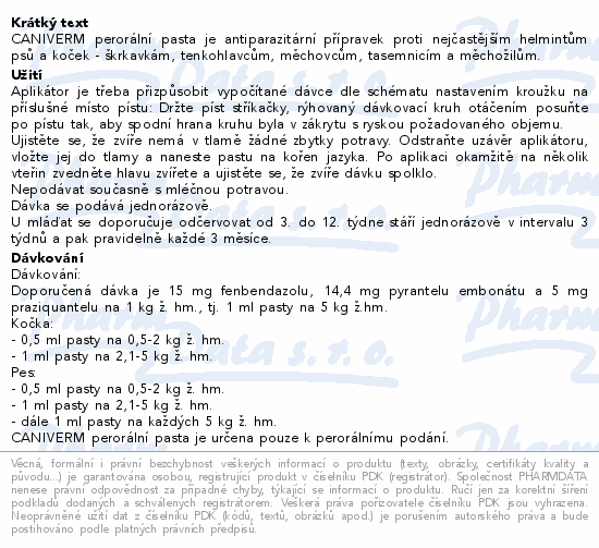 CANIVERM perorální pasta je antiparazitární přípravek proti nejčastějším helmintům psů a koček - škrkavkám, tenkohlavcům, měchovcům, tasemnicím a měchožilům.