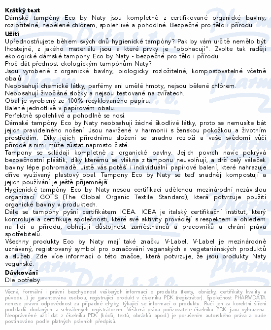 Dámské tampóny Eco by Naty jsou kompletně z certifikované organické bavlny, rozložitelné, nebělené chlórem, spolehlivé a pohodlné. Bezpečné pro tělo i přírodu.