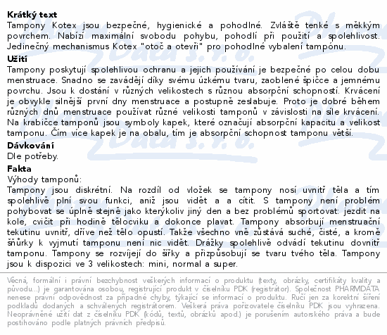 Tampony Kotex jsou bezpečné, hygienické a pohodlné. Zvláště tenké s měkkým povrchem. Nabízí maximální svobodu pohybu, pohodlí při použití a spolehlivost. Jedinečný mechanismus Kotex "otoč a otevři" pro pohodlné vybalení tampónu.