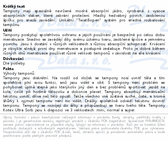 Tampony mají speciálně navržené modré absorpční jádro, vyrobené z vysoce absorpčních vláken, které zabrání protečení. Hladký hedvábný povrch, zaoblenou špičku pro snazší zavádění. Unikátní “Twist&open“ systém pro snadné rozbalování tampónu.