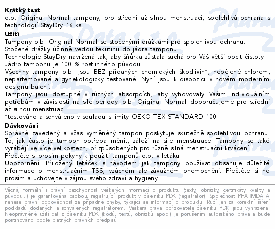 o.b. Original Normal tampony, pro střední až silnou menstruaci, spolehlivá ochrana s technologií StayDry 16 ks.