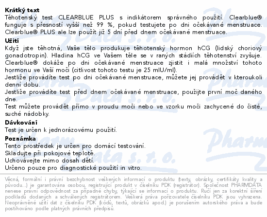 Těhotenský test CLEARBLUE PLUS s indikátorem správného použití. Clearblue® funguje s přesností vyšší než 99 %, pokud testujete po dni očekávané menstruace. Clearblue® PLUS ale lze použít již 5 dní před dnem očekávané menstruace.