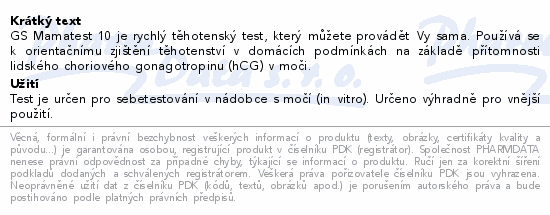 GS Mamatest 10 je rychlý těhotenský test, který můžete provádět Vy sama. Používá se k orientačnímu zjištění těhotenství v domácích podmínkách na základě přítomnosti lidského choriového gonagotropinu (hCG) v moči.