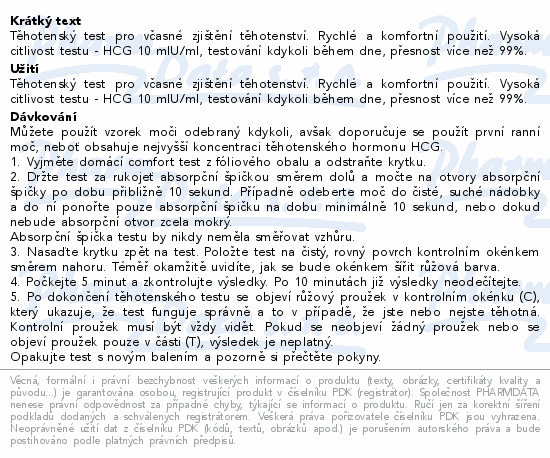 Těhotenský test pro včasné zjištění těhotenství. Rychlé a komfortní použití. Vysoká citlivost testu - HCG 10 mlU/ml, testování kdykoli během dne, přesnost více než 99%.