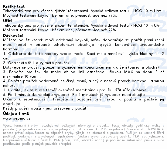 Těhotenský test pro včasné zjištění těhotenství. Vysoká citlivost testu - HCG 10 mllu/ml, lze provádět již 2 dny od početí, zhruba 7 dnů před očekávanou menstruací, testování kdykoli během dne, přesnost více než 99%.