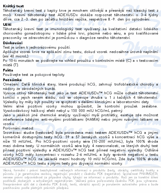 Těhotenský krevní test z kapky krve je mnohem citlivější a přesnější než klasický test z moči. Krevní těhotenský test ADEXUSDx dokáže rozpoznat těhotenství o 3-4 týdny dříve, cca 2.-3. den po začátku hnízdění vajíčka, respektive 8.-9. den po oplodnění.