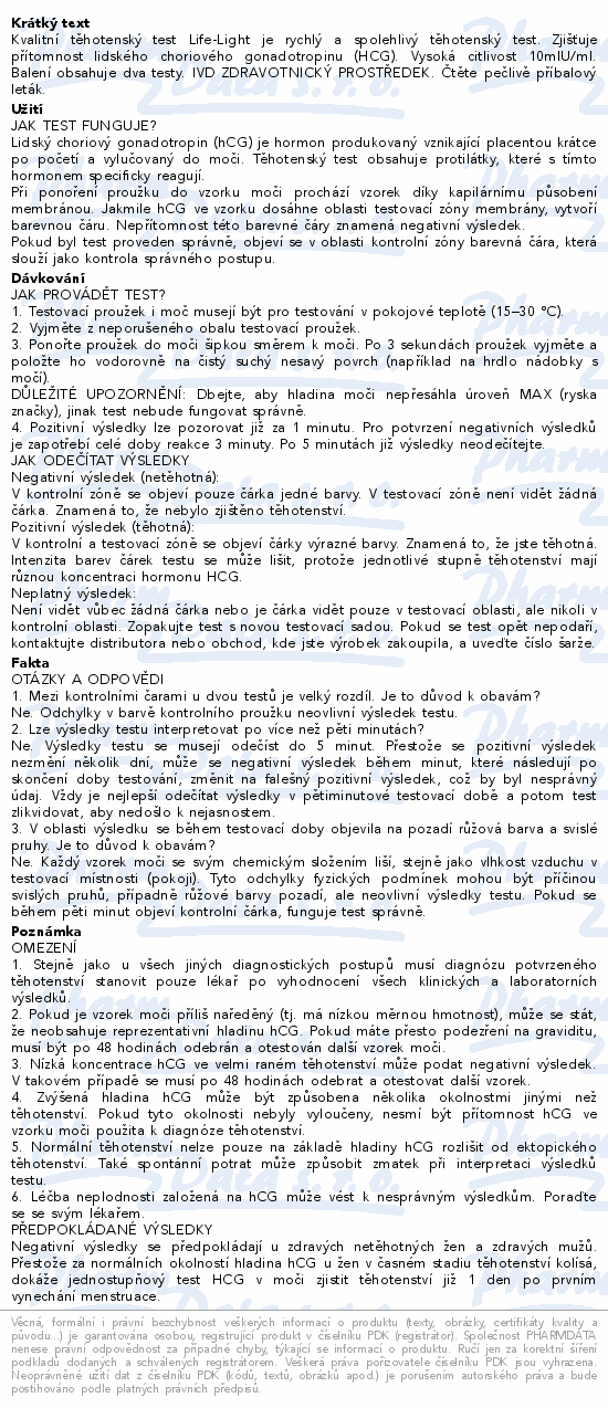 Kvalitní těhotenský test Life-Light je rychlý a spolehlivý těhotenský test. Zjišťuje přítomnost lidského choriového gonadotropinu (HCG). Vysoká citlivost 10mlU/ml. Balení obsahuje dva testy. IVD ZDRAVOTNICKÝ PROSTŘEDEK. Čtěte pečlivě příbalový leták.