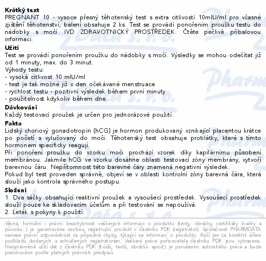PREGNANT 10 - vysoce přesný těhotenský test s extra citlivostí 10mlU/ml pro včasné zjištění těhotenství, balení obsahuje 2 ks. Test se provádí ponořením proužku testu do nádobky s močí. IVD ZDRAVOTNICKÝ PROSTŘEDEK. Čtěte pečlivě příbalovou informaci.