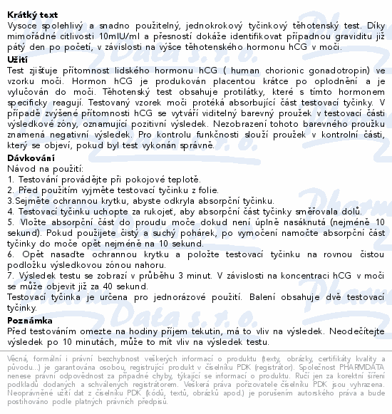 Vysoce spolehlivý a snadno použitelný, jednokrokový tyčinkový těhotenský test. Díky mimořádné citlivosti 10mlU/ml a přesností dokáže identifikovat případnou graviditu již pátý den po početí, v závislosti na výšce těhotenského hormonu hCG v moči.
