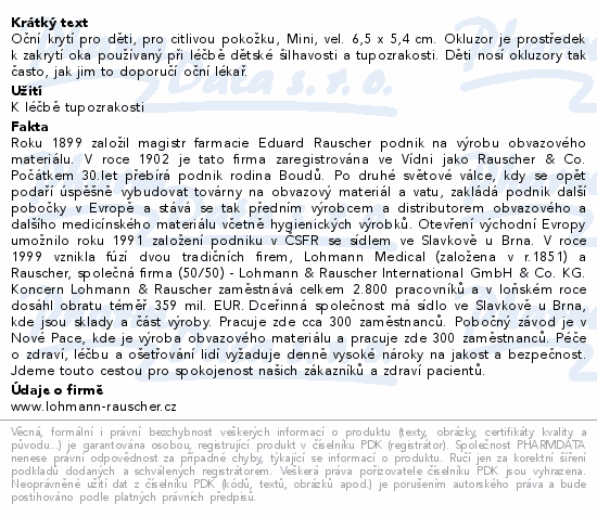 Oční krytí pro děti, pro citlivou pokožku, Mini, vel. 6,5 x 5,4 cm. Okluzor je prostředek k zakrytí oka používaný při léčbě dětské šilhavosti a tupozrakosti. Děti nosí okluzory tak často, jak jim to doporučí oční lékař.