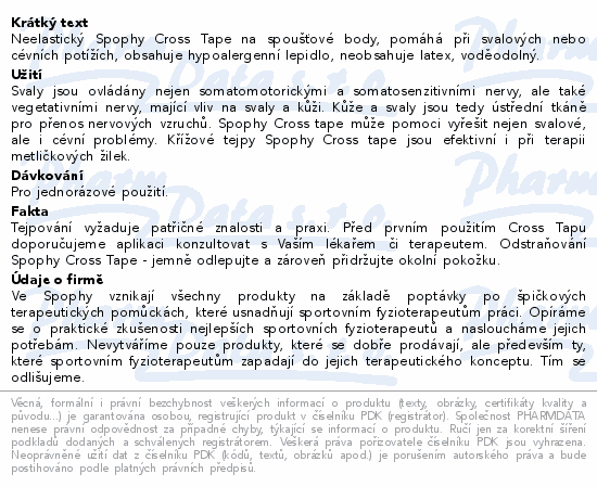 Neelastický Spophy Cross Tape na spoušťové body, pomáhá při svalových nebo cévních potížích, obsahuje hypoalergenní lepidlo, neobsahuje latex, voděodolný.