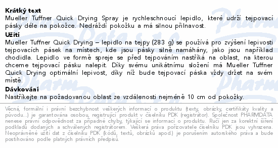 Mueller Tuffner Quick Drying Spray je rychleschnoucí lepidlo, které udrží tejpovací pásky déle na pokožce. Nedráždí pokožku a má silnou přilnavost.