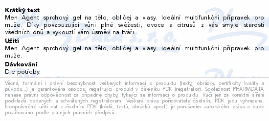 Men Agent sprchový gel na tělo, obličej a vlasy. Ideální multifunkční přípravek pro muže. Díky povzbuzující vůni plné svěžesti, ovoce a citrusů z vás smyje starosti všedních dnů a vykouzlí vám úsměv na tváři.
