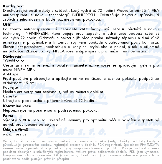 Dlouhotrvající pocit čistoty a svěžesti, který vydrží až 72 hodin? Přesně to přináší NIVEA antiperspirant s novou technologií INFINIFRESH. Odstraňuje bakterie způsobující zápach a jeho složení si bude rozumět s vaší pokožkou.