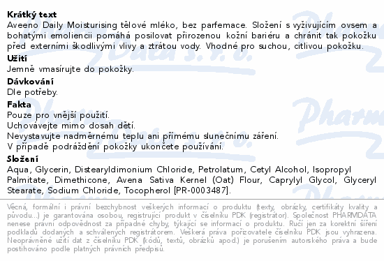 Aveeno Daily Moisturising tělové mléko, bez parfemace. Složení s vyživujícím ovsem a bohatými emoliencii pomáhá posilovat přirozenou kožní bariéru a chránit tak pokožku před externími škodlivými vlivy a ztrátou vody. Vhodné pro suchou, citlivou pokožku.
