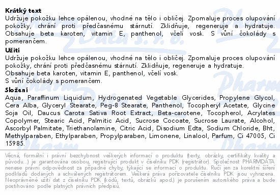 Udržuje pokožku lehce opálenou, vhodné na tělo i obličej. Zpomaluje proces olupování pokožky, chrání proti předčasnému stárnutí. Zklidňuje, regeneruje a hydratuje. Obsahuje beta karoten, vitamin E, panthenol, včelí vosk. S vůní čokolády s pomerančem.