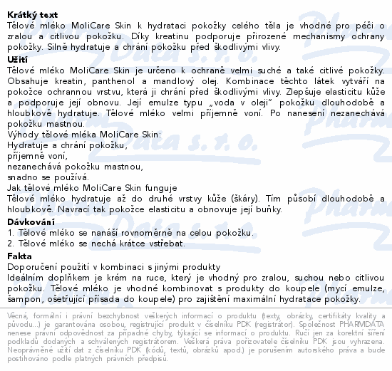 Tělové mléko MoliCare Skin k hydrataci pokožky celého těla je vhodné pro péči o zralou a citlivou pokožku. Díky kreatinu podporuje přirozené mechanismy ochrany pokožky. Silně hydratuje a chrání pokožku před škodlivými vlivy.