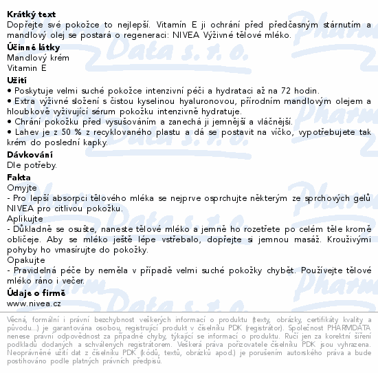 Dopřejte své pokožce to nejlepší. Vitamín E ji ochrání před předčasným stárnutím a mandlový olej se postará o regeneraci: NIVEA Výživné tělové mléko.